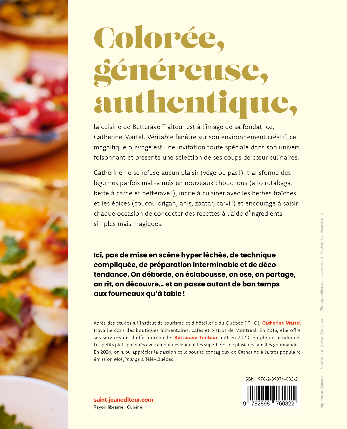 Colorée, généreuse, authentique, la cuisine de Betterave Traiteur est à l’image de sa fondatrice, Catherine Martel. Véritable fenêtre sur son environnement créatif, ce magnifique ouvrage est une invitation toute spéciale dans son univers foisonnant et présente une sélection de ses coups de cœur culinaires. Catherine ne se refuse aucun plaisir (végé ou pas !), transforme des légumes parfois mal-aimés en nouveaux chouchous (allo rutabaga, bette à carde et betterave !), incite à cuisiner avec les herbes fraîches et les épices (coucou origan, anis, zaatar, carvi !) et encourage à saisir chaque occasion de concocter des recettes à l’aide d’ingrédients simples mais magiques.Ici, pas de mise en scène hyper léchée, de technique compliquée, de préparation interminable et de déco tendance. On déborde, on éclabousse, on ose, on partage, on rit, on découvre… et on passe autant de bon temps aux fourneaux qu’à table !