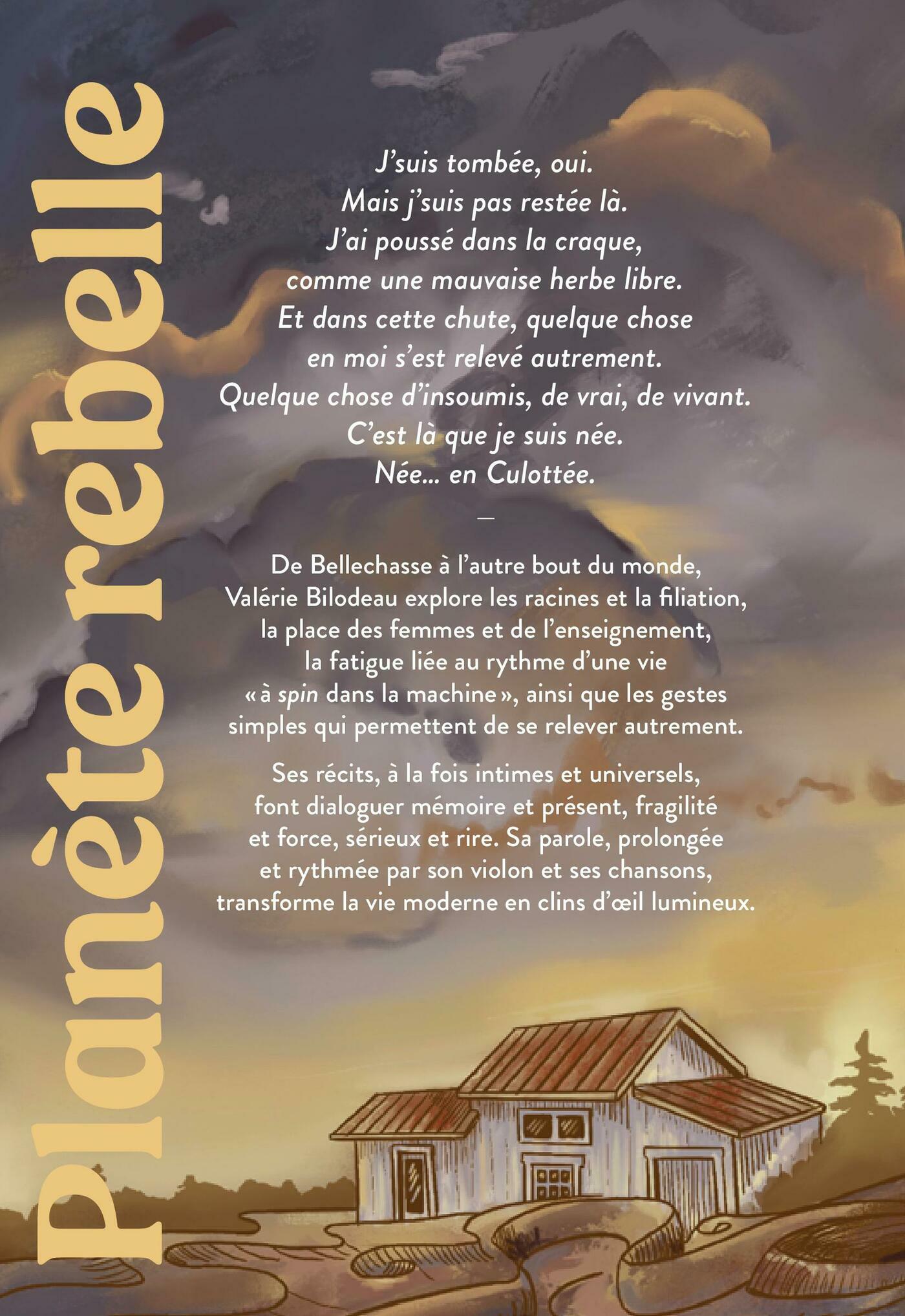 J’suis tombée, oui.Mais j’suis pas restée là.J’ai poussé dans la craque, comme une mauvaise herbe libre.Et dans cette chute, quelque chose en moi s’est relevé autrement.Quelque chose d’insoumis, de vrai, de vivant.C’est là que je suis née. Née… en Culottée.—De Bellechasse à l’autre bout du monde, Valérie Bilodeau explore les racines et la filiation, la place des femmes et de l’enseignement, la fatigue liée au rythme d’une vie « à spin dans la machine », ainsi que les gestes simples qui permettent de se relever autrement.Ses récits, à la fois intimes et universels, font dialoguer mémoire et présent, fragilité et force, sérieux et rire. Sa parole, prolongée et rythmée par son violon et ses chansons, transforme la vie moderne en clins d’œil lumineux.