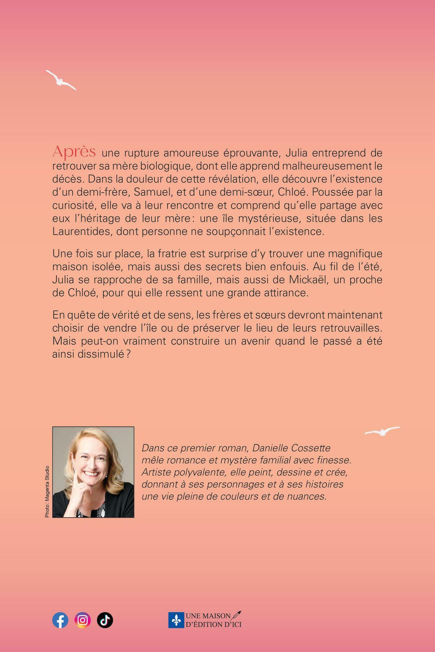 Après une rupture amoureuse éprouvante, Julia entreprend deretrouver sa mère biologique, dont elle apprend malheureusement ledécès. Dans la douleur de cette révélation, elle découvre l’existenced’un demi-frère, Samuel, et d’une demi-sœur, Chloé. Poussée par lacuriosité, elle va à leur rencontre et comprend qu’elle partage aveceux l’héritage de leur mère : une île mystérieuse, située dans lesLaurentides, dont personne ne soupçonnait l’existence.Une fois sur place, la fratrie est surprise d’y trouver une magnifiquemaison isolée, mais aussi des secrets bien enfouis. Au fil de l’été,Julia se rapproche de sa famille, mais aussi de Mickaël, un prochede Chloé, pour qui elle ressent une grande attirance.En quête de vérité et de sens, les frères et sœurs devront maintenantchoisir de vendre l’île ou de préserver le lieu de leurs retrouvailles.Mais peut-on vraiment construire un avenir quand le passé a étéainsi dissimulé ?