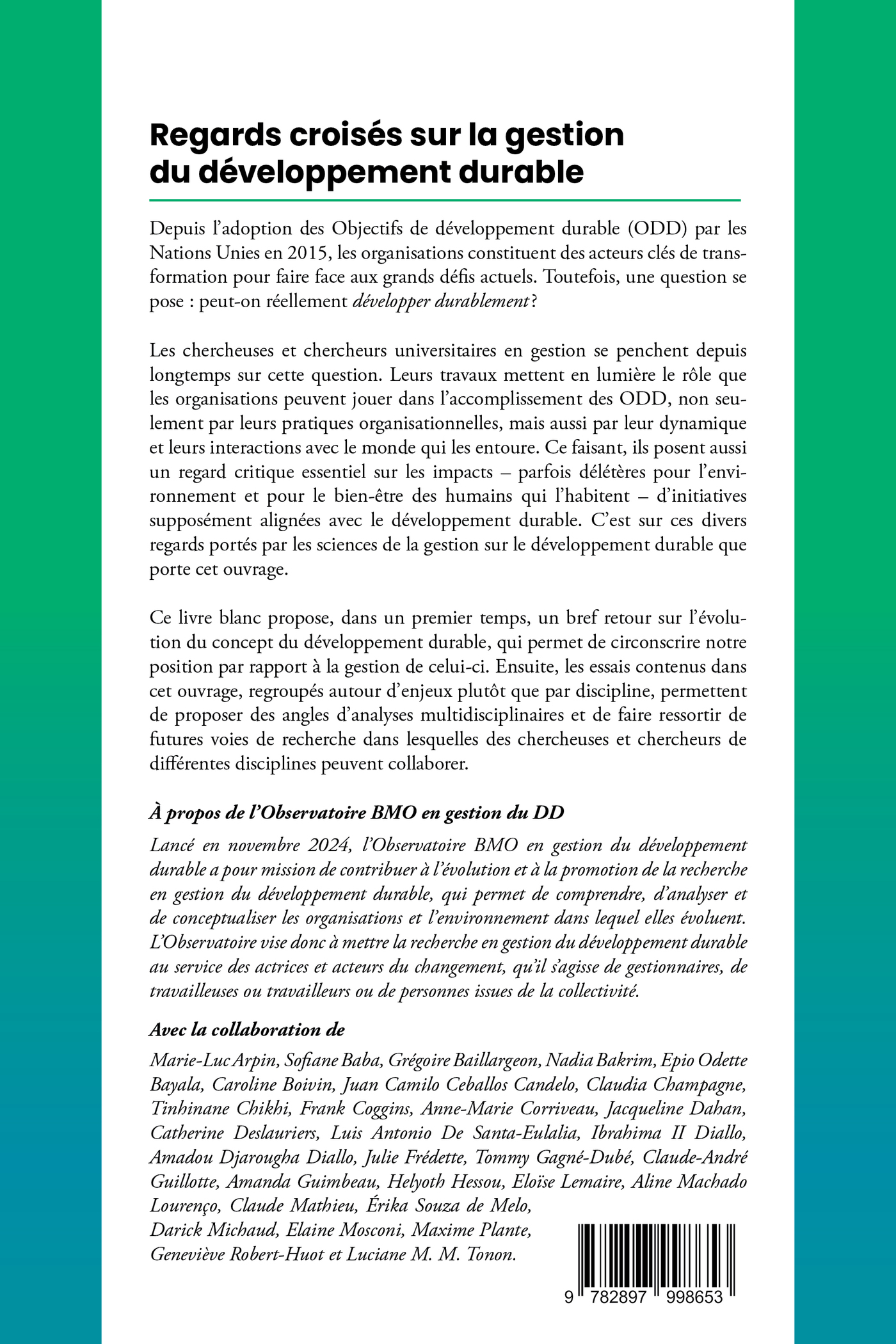 Depuis l’identification des objectifs de Développement durable (ODD) par les Nations-Unies en 2015, les organisations sont identifiées comme un vecteur important de transformation pour faire face aux grands défis actuels. Toutefois, un important dilemme s’impose : peut-on réellement développer durablement ?Les chercheuses et chercheurs universitaires en gestion se penchent depuis longtemps sur cette question. Leurs travaux mettent en lumière le rôle que les organisations peuvent jouer, non seulement par leurs pratiques organisationnelles mais par leur dynamique et leurs interactions avec le monde qui les entoure dans la progression vers l’atteinte des ODD. Ce faisant, ils posent aussi un regard critique essentiel sur les impacts, parfois délétères pour l’environnement et pour le bien-être des humains qui l’habitent, d’initiatives supposées alignées avec le développement durable. C’est sur ces divers regards portés par les sciences de la gestion sur le développement durable que porte cet ouvrage.Ce livre blanc propose, dans un premier temps, un bref retour sur l’évolution du concept du développement durable qui permet de circonscrire notre posture par rapport à la gestion de celui-ci. Ensuite, les essais contenus dans cet ouvrage, regroupés autour d’enjeux plutôt que par discipline, permettent de proposer des angles d’analyses multidisciplinaires et de faire ressortir de futures voies de recherche dans lesquelles des chercheuses et chercheurs de différentes disciplines peuvent collaborer.À propos de l’Observatoire BMO en gestion du DD Lancé en novembre 2024, l’Observatoire BMO en gestion du développement durable a pour mission de contribuer à l’évolution et à la promotion de la recherche en gestion du développement durable, qui permet de comprendre, analyser, conceptualiser les organisations et l’environnement dans lequel elles évoluent. L’Observatoire vise donc à mettre la recherche en gestion du développement durable au service des actrices et acteurs du changement, qu’ils soient gestionnaires, travailleuses ou citoyennes.Avec la collaboration de Marie-Luc Arpin, Sofiane Baba, Grégoire Baillargeon, Nadia Bakrim, Epio Odette Bayala, Caroline Boivin, Juan Camilo Ceballos Candelo, Claudia Champagne, Tinhinane Chikhi, Frank Coggins, Anne-Marie Corriveau, Jacqueline Dahan, Catherine Deslauriers, Luis Antonio De Santa-Eulalia, Ibrahima II Diallo, Amadou Djarougha Diallo, Julie Frédette, Tommy Gagné-Dubé, Claude-André Guillotte, Amanda Guimbeau, Helyoth Hessou, Eloïse Lemaire, Claude Mathieu, Érika Souza de Melo, Darick Michaud, Elaine Mosconi, Maxime Plante, Geneviève Robert-Huot et Luciane M. M. Tonon.