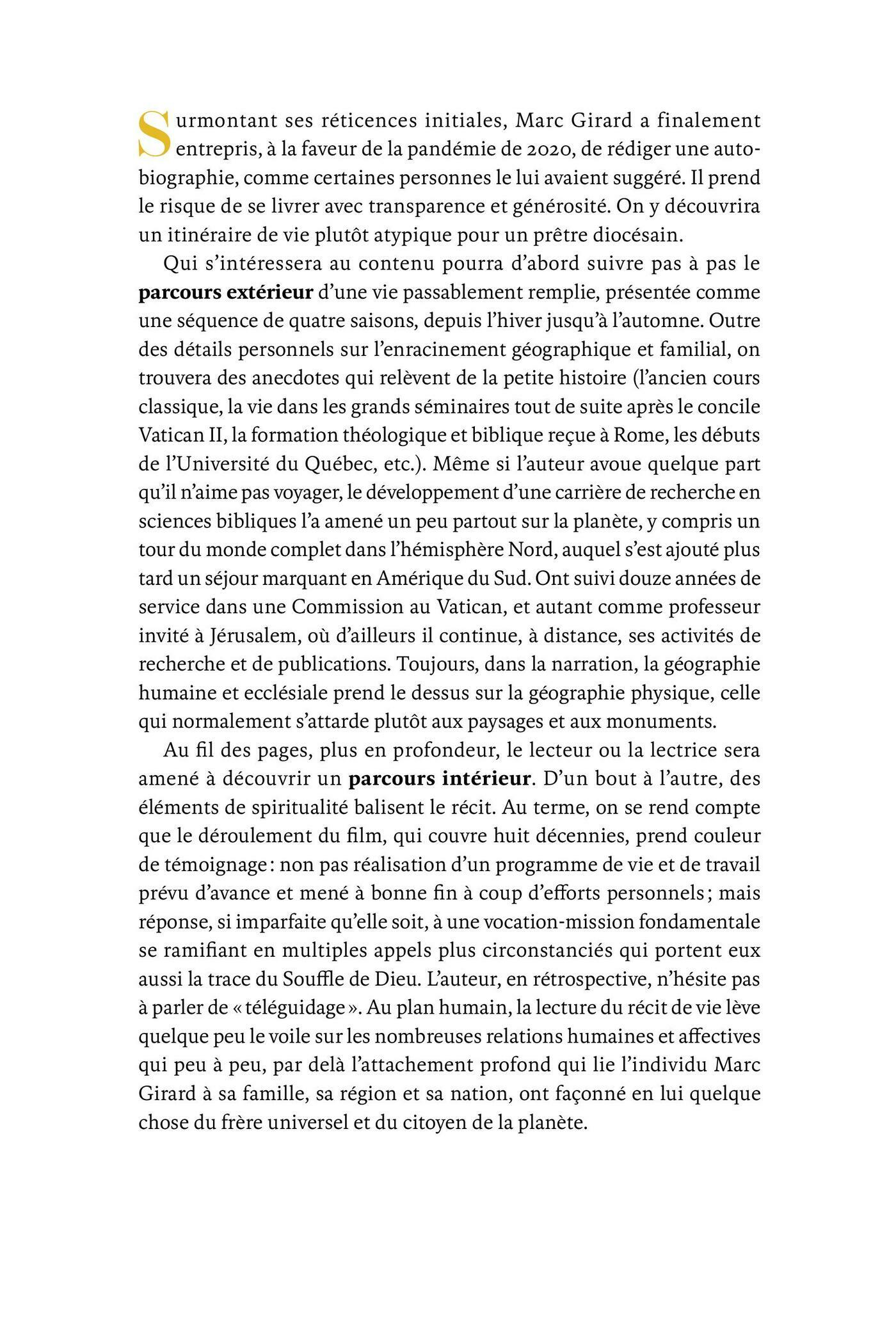 Surmontant ses réticences initiales, Marc Girard a finalement entrepris, à la faveur de la pandémie de 2020, de rédiger une autobiographie, comme certaines personnes le lui avaient suggéré. Il prend le risque de se livrer avec transparence et générosité. On y découvrira un itinéraire de vie plutôt atypique pour un prêtre diocésain.Qui s’intéressera au contenu pourra d’abord suivre pas à pas le parcours extérieur d’une vie passablement remplie, présentée comme une séquence de quatre saisons, depuis l’hiver jusqu’à l’automne. Outre des détails personnels sur l’enracinement géographique et familial, on trouvera des anecdotes qui relèvent de la petite histoire (l’ancien cours classique, la vie dans les grands séminaires tout de suite après le concile Vatican II, la formation théologique et biblique à Rome à la même époque). Même si l’auteur avoue quelque part qu’il n’aime pas voyager, le développement d’une carrière de recherche en sciences bibliques l’a amené un peu partout sur la planète, y compris un tour du monde complet dans l’hémisphère Nord, auquel s’est ajouté plus tard un séjour marquant en Amérique du Sud. Ont suivi douze années de service dans une Commission au Vatican, et autant comme professeur invité à Jérusalem, où d’ailleurs il continue, à distance, ses activités de recherche et de publications. Toujours, dans la narration, la géographie humaine et ecclésiale prend le dessus sur la géographie physique, celle qui normalement s’attarde plutôt aux paysages et aux monuments.Au fil des pages, plus en profondeur, le lecteur ou la lectrice sera amené à découvrir un parcours intérieur. D’un bout à l’autre, des éléments de spiritualité balisent le récit. Au terme, on se rend compte que le déroulement du film, qui couvre huit décennies, prend couleur de témoignage : non pas réalisation d’un programme de vie et de travail prévu d’avance et mené à bonne fin à coup d’efforts personnels ; mais réponse, si imparfaite qu’elle soit, à une vocation-mission fondamentale qui se ramifie en multiples appels plus circonstanciés qui portent eux aussi la trace du Souffle de Dieu. L’auteur, en rétrospective, n’hésite pas à parler de « téléguidage ». Au plan humain, la lecture du récit de vie lève quelque peu le voile sur les nombreuses relations humaines et affectives qui peu à peu, par-delà l’attachement profond qui lie l’individu Marc Girard à sa famille, sa région et sa nation, ont façonné en lui quelque chose du frère universel et du citoyen de la planète.