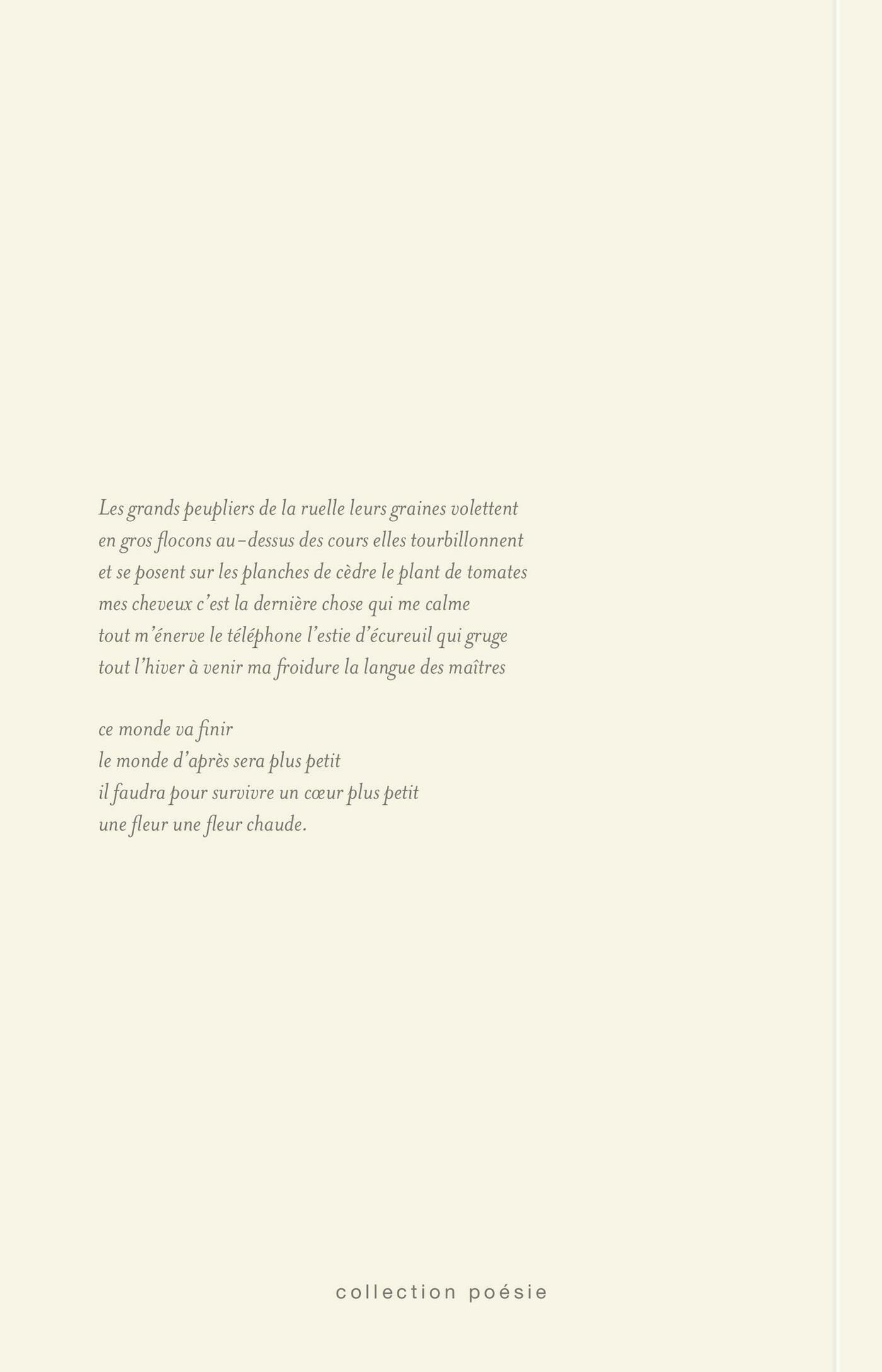 Caroline Allard, Nicolas Langelier, Marie-Claude Élie-Morin, Pierre-Olivier Pineau, Denis Côté, Marc-André Cyr, Gabrielle Immarigeon, Valérian Mazataud, Binh An Vu Van, Caroline R. Paquette, Pierrick Blin, Antoine Dion-Ortega, Luce Tremblay-Gaudette, Ryoa Chung, David Suzuki, Blaise Cendrars, Xavier Jacob, Kim Thúy, François Rioux, Benoît Melançon, Olivier Lalande, William S. Messier, Julie Buchinger, Jacques Godbout, Judith Oliver, Miguel Tremblay, Julien Castanié