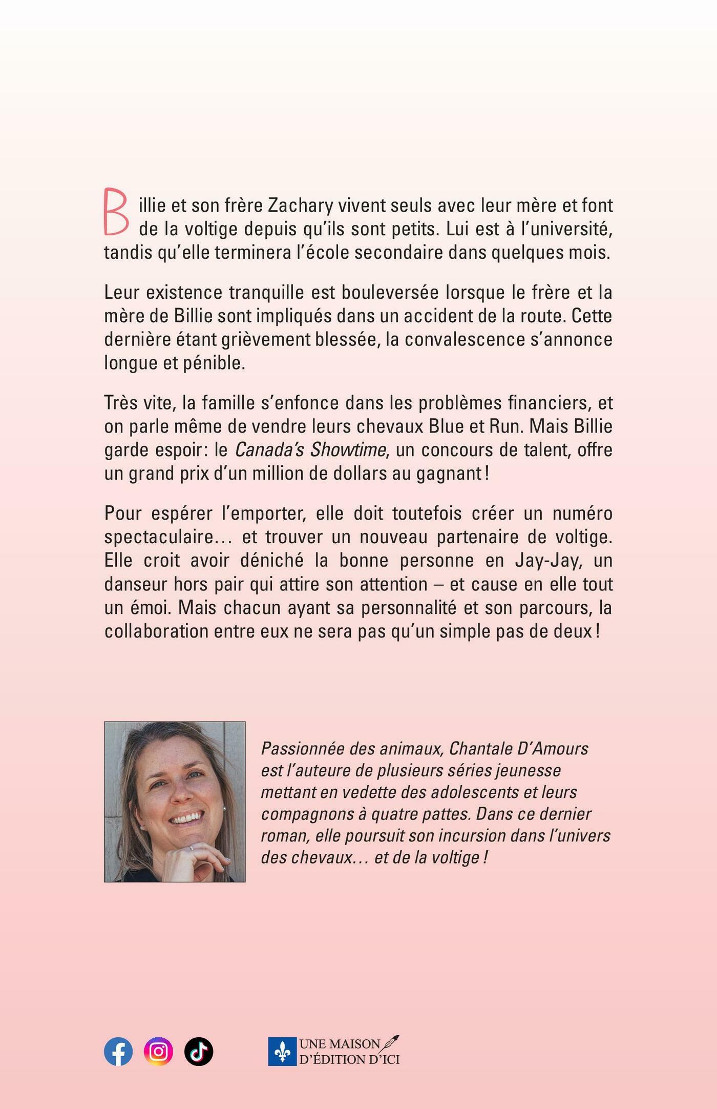 Billie et son frère Zachary vivent seuls avec leur mère et fontde la voltige depuis qu’ils sont petits. Lui est à l’université,tandis qu’elle terminera l’école secondaire dans quelques mois.Leur existence tranquille est bouleversée lorsque le frère et lamère de Billie sont impliqués dans un accident de la route. Cettedernière étant grièvement blessée, la convalescence s’annoncelongue et pénible.Très vite, la famille s’enfonce dans les problèmes financiers, eton parle même de vendre leurs chevaux Blue et Run. Mais Billiegarde espoir : leCanada’s Showtime, un concours de talent, offre un grand prix d’un million de dollars au gagnant !Pour espérer l’emporter, elle doit toutefois créer un numérospectaculaire... et trouver un nouveau partenaire de voltige.Elle croit avoir déniché la bonne personne en Jay-Jay, undanseur hors pair qui attire son attention – et cause en elle toutun émoi. Mais chacun ayant sa personnalité et son parcours, lacollaboration entre eux ne sera pas qu’un simple pas de deux !