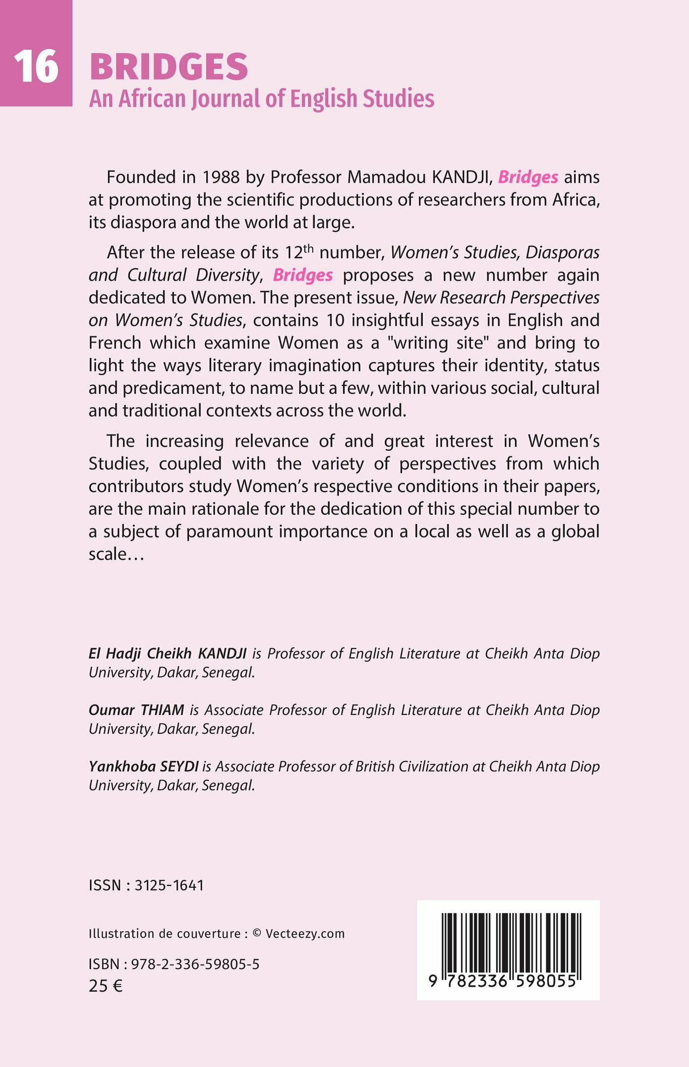 Founded in 1988 by Professor Mamadou KANDJI, Bridges aims at promoting the scientific productions of researchers from Africa,its diaspora and the world at large. After the release of its 12th number, Women’s Studies, Diasporasand Cultural Diversity, Bridges proposes a new number again dedicated to Women. The present issue, New Research Perspectiveson Women’s Studies, contains 10 insightful essays in English andFrench which examine Women as a "writing site" and bring to light the ways literary imagination captures their identity, status and predicament, to name but a few, within various social, cultural and traditional contexts across the world. The increasing relevance of and great interest in Women’sStudies, coupled with the variety of perspectives from whichcontributors study Women’s respective conditions in their papers,are the main rationale for the dedication of this special number to a subject of paramount importance on a local as well as a global scale…