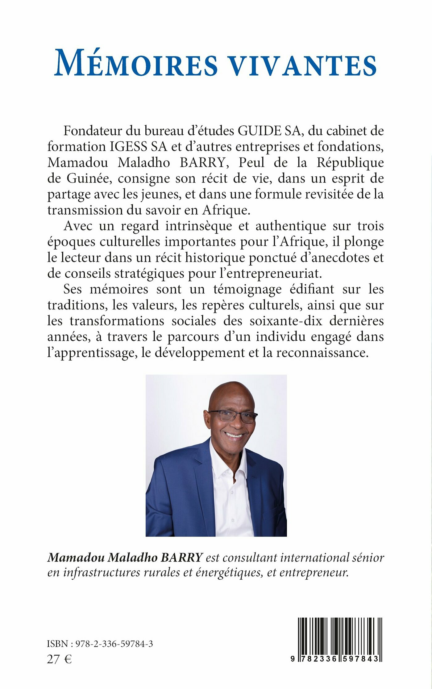 Fondateur du bureau d’études GUIDE SA, du cabinet de formation IGESS SA et d’autres entreprises et fondations, Mamadou Maladho BARRY, Peul de la République de Guinée, consigne son récit de vie, dans un esprit de partage avec les jeunes, et dans une formule revisitée de la transmission du savoir en Afrique.