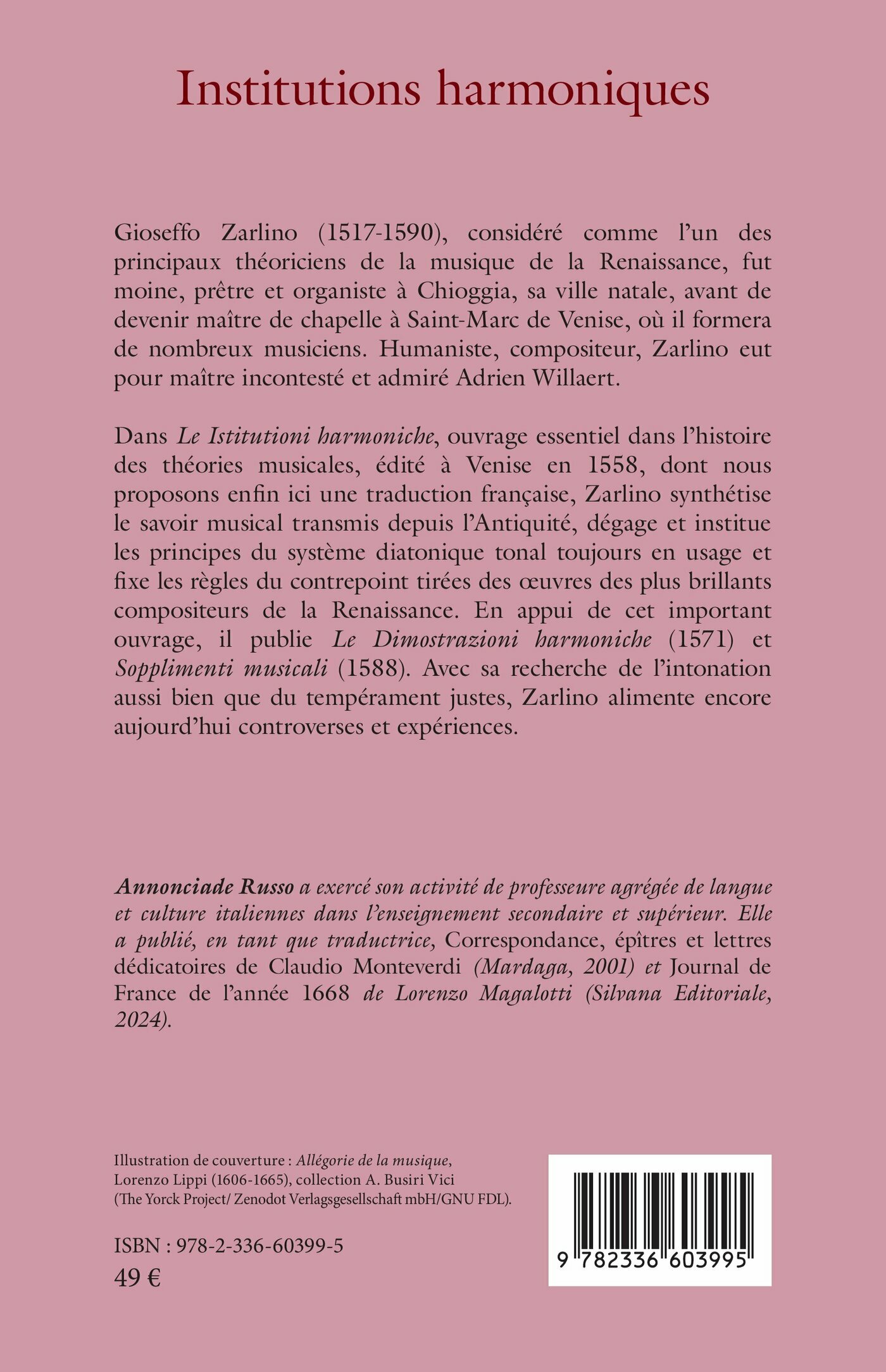 Dans Le Istitutioni harmoniche, ouvrage essentiel dans l’histoire des théories musicales, édité à Venise en 1558, dont nous proposons enfin ici une traduction française, Zarlino synthétise le savoir musical transmis depuis l’Antiquité, dégage et institue les principes du système diatonique tonal toujours en usage et fixe les règles du contrepoint tirées des œuvres des plus brillants compositeurs de la Renaissance. En appui de cet important ouvrage, il publie Le Dimostrazioni harmoniche (1571) et Sopplimenti musicali (1588). Avec sa recherche de l’intonation aussi bien que du tempérament justes, Zarlino alimente encore aujourd’hui controverses et expériences.