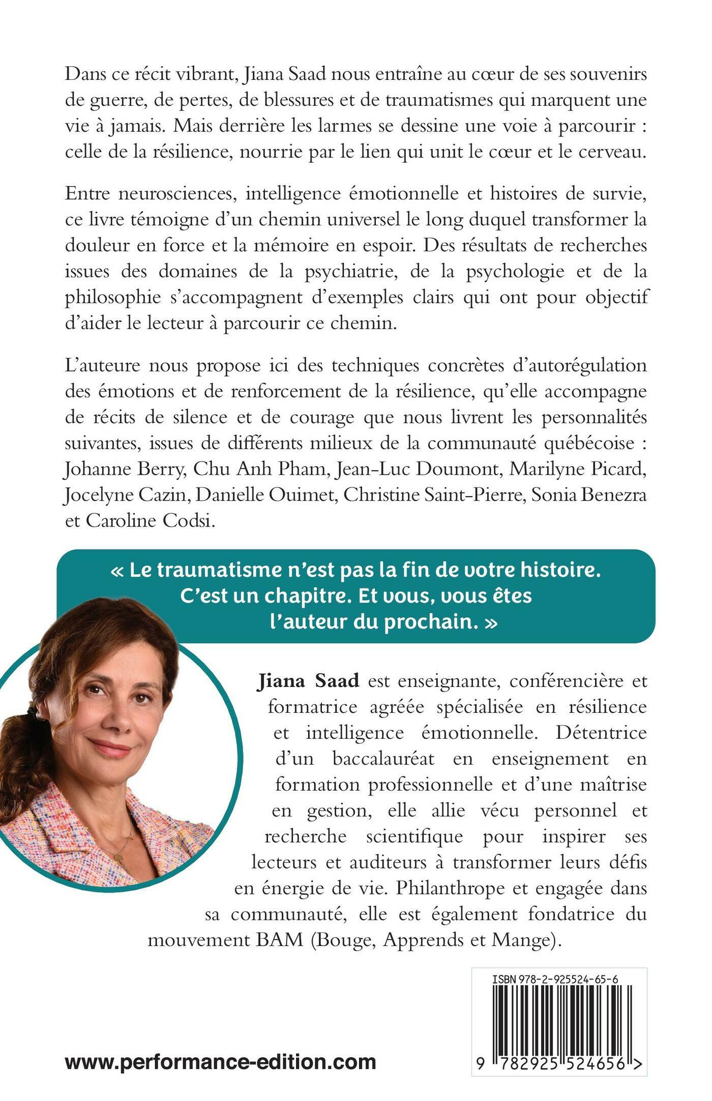 Dans ce récit vibrant, Jiana Saad nous entraîne au cœur de ses souvenirs de guerre, de pertes, de blessures et de traumatismes qui marquent une vie à jamais. Mais derrière les larmes se dessine une voie à parcourir : celle de la résilience, nourrie par le lien qui unit le cœur et le cerveau.Entre neurosciences, intelligence émotionnelle et histoires de survie, ce livre témoigne d’un chemin universel le long duquel transformer la douleur en force et la mémoire en espoir. Des résultats de recherches issues des domaines de la psychiatrie, de la psychologie et de la philosophie s’accompagnent d’exemples clairs qui ont pour objectif d’aider le lecteur à parcourir ce chemin.L’auteure nous propose ici des techniques concrètes d’autorégulation des émotions et de renforcement de la résilience, qu’elle accompagne de récits de silence et de courage que nous livrent les personnalités suivantes, issues de différents milieux de la communauté québécoise : Johanne Berry, Chu Anh Pham, Jean-Luc Doumont, Marilyne Picard, Jocelyne Cazin, Danielle Ouimet, Christine Saint-Pierre, Sonia Benezra et Caroline Codsi.