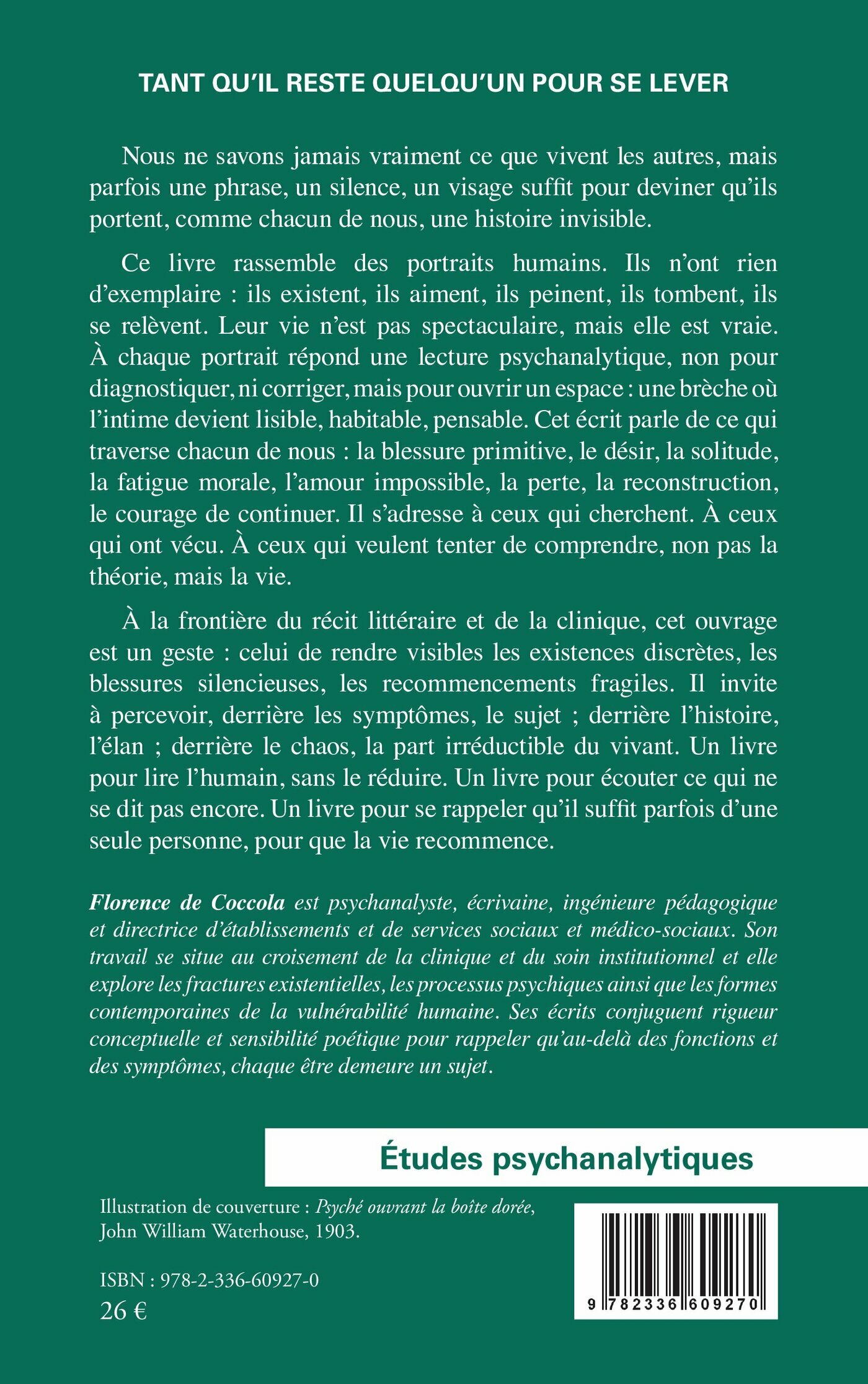Ce livre rassemble des portraits humains. Ils n’ont rien d’exemplaire : ils existent, ils aiment, ils peinent, ils tombent, ils se relèvent. Leur vie n’est pas spectaculaire, mais elle est vraie. À chaque portrait répond une lecture psychanalytique, non pour diagnostiquer, ni corriger, mais pour ouvrir un espace : une brèche où l’intime devient lisible, habitable, pensable. Cet écrit parle de ce qui traverse chacun de nous : la blessure primitive, le désir, la solitude, la fatigue morale, l’amour impossible, la perte, la reconstruction, le courage de continuer. Il s’adresse à ceux qui cherchent. À ceux qui ont vécu. À ceux qui veulent tenter de comprendre, non pas la théorie, mais la vie.