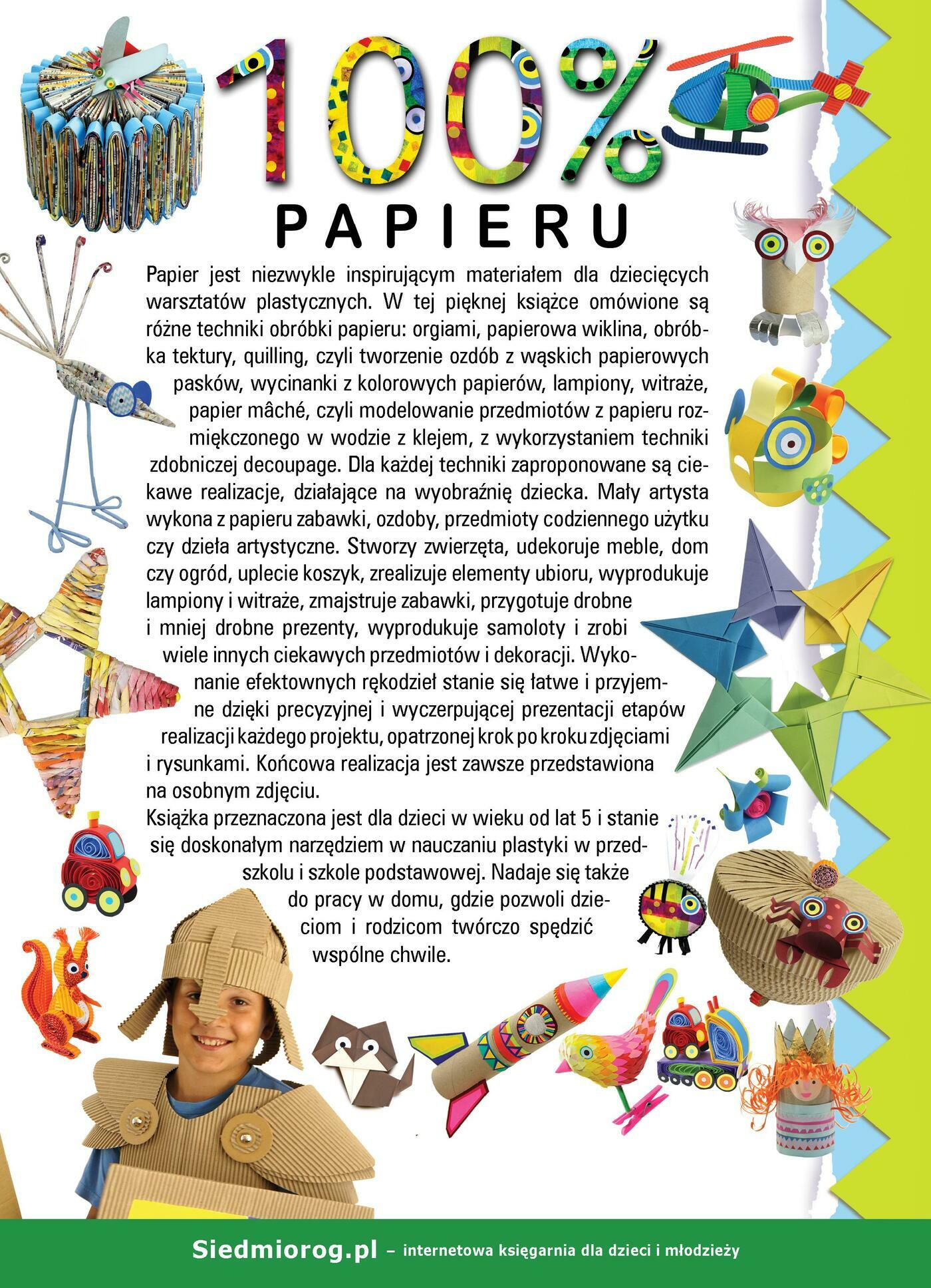Papier jest niezwykle inspirującym materiałem dla dziecięcych warsztatów plastycznych. W tej pięknej książce omówione są różne techniki obróbki papieru: orgiami, papierowa wiklina, obróbka tektury, quilling, czyli tworzenie ozdób z wąskich papierowych pasków, wycinanki z kolorowych papierów, lampiony, witraże, papier mâché, czyli modelowanie przedmiotów z papieru rozmiękczonego w wodzie z klejem, z wykorzystaniem techniki zdobniczej decoupage. Dla każdej techniki zaproponowane są ciekawe realizacje, działające na wyobraźnię dziecka. Mały artysta wykona z papieru zabawki, ozdoby, przedmioty codziennego użytku czy dzieła artystyczne. Stworzy zwierzęta, udekoruje meble, dom czy ogród, uplecie koszyk, zrealizuje elementy ubioru, wyprodukuje lampiony i witraże, zmajstruje zabawki, przygotuje drobne i mniej drobne prezenty, wyprodukuje samoloty i zrobi wiele innych ciekawych przedmiotów i dekoracji. Wykonanie efektownych rękodzieł stanie się łatwe i przyjemne dzięki precyzyjnej i wyczerpującej prezentacji etapów realizacji każdego projektu, opatrzonej krok po kroku zdjęciami i rysunkami. Końcowa realizacja jest zawsze przedstawiona na osobnym zdjęciu. Książka przeznaczona jest dla dzieci w wieku od lat 5 i stanie się doskonałym narzędziem w nauczaniu plastyki w przedszkolu i szkole podstawowej. Nadaje się także do pracy w domu, gdzie pozwoli dzieciom i rodzicom twórczo spędzić wspólne chwile.