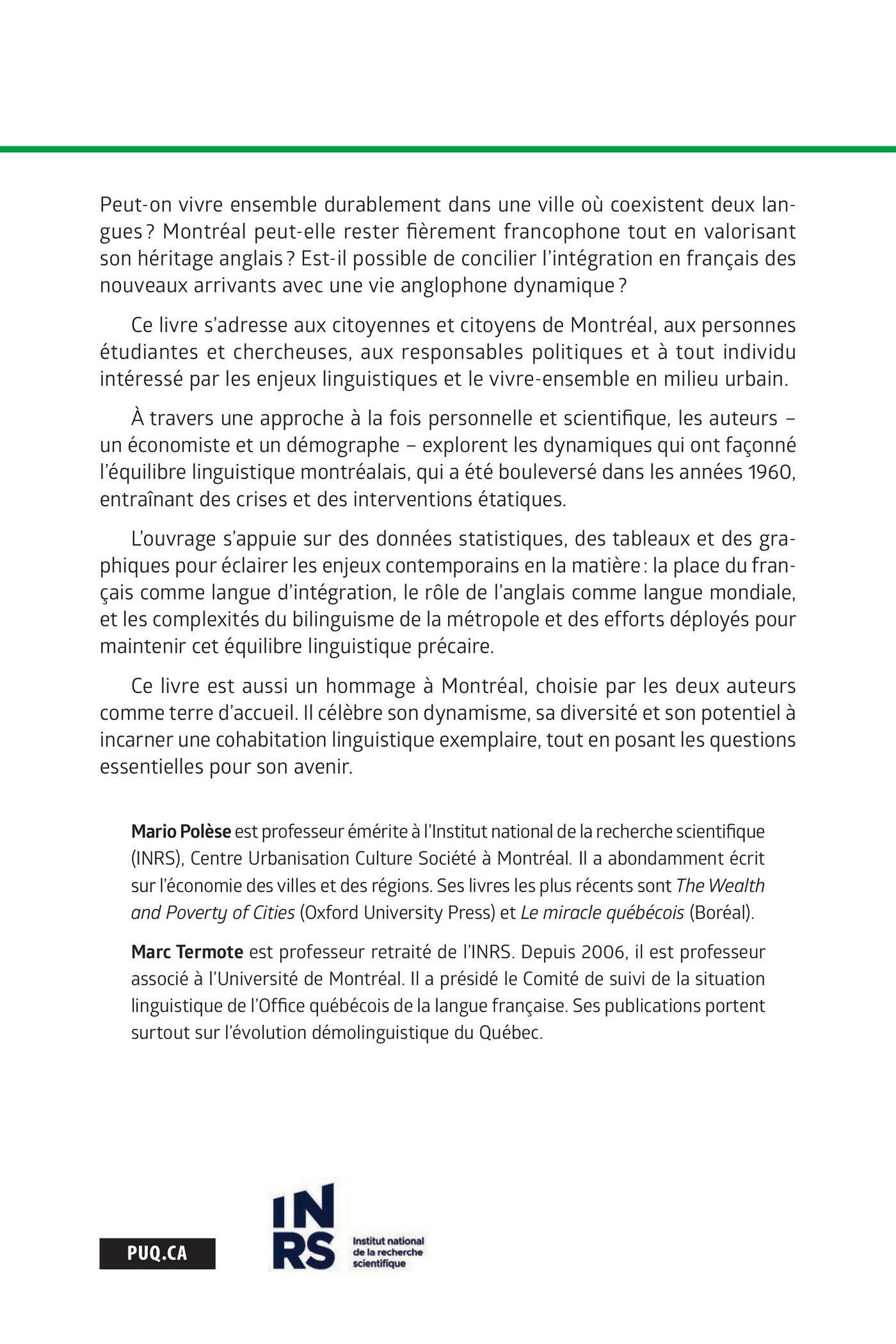 Peut-on vivre ensemble durablement dans une ville où coexistent deux langues ? Montréal peut-elle rester fièrement francophone tout en valorisant son héritage anglais ? Est-il possible de concilier l’intégration en français des nouveaux arrivants avec une vie anglophone dynamique ?Ce livre s’adresse aux citoyennes et citoyens de Montréal, aux personnes étudiantes et chercheuses, aux responsables politiques et à tout individu intéressé par les enjeux linguistiques et le vivre-ensemble en milieu urbain.