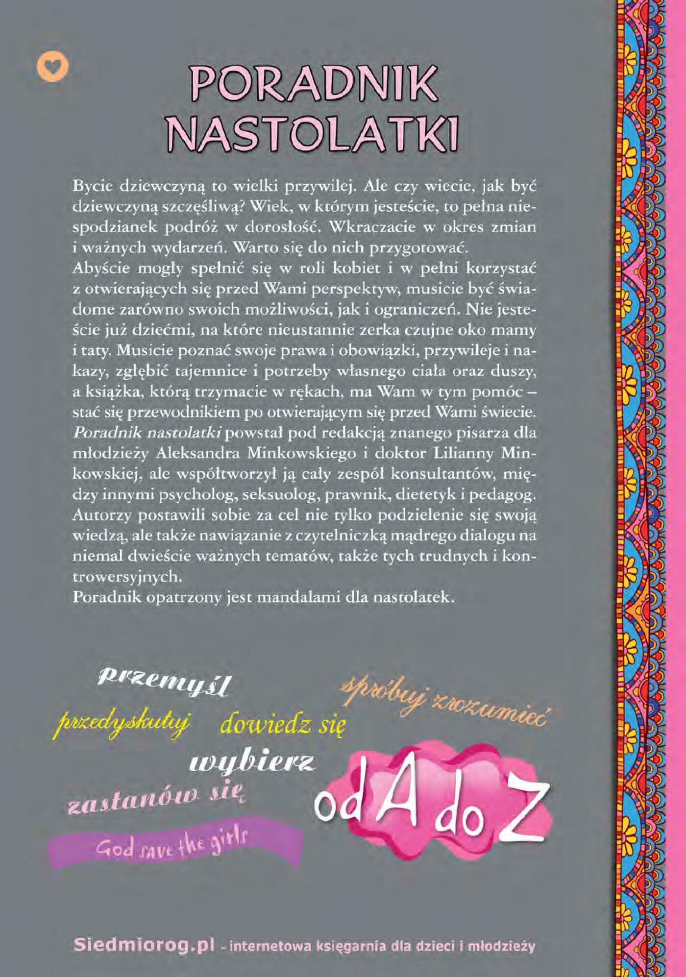 Niełatwo być nastolatką. Co krok to problemy, pytania, wątpliwości. Często brak Ci odwagi albo się wstydzisz zapytać – i jest to zrozumiałe. Nie możesz przecież otwierać szeroko drzwi do swego intymnego świata. Zmienia się Twoje ciało. Obserwujesz te zmiany z niepokojem, niekiedy z lękiem. Co o nich wiesz? Co czeka Cię jeszcze? Odkrywasz w sobie nieznane dotąd uczucia i pragnienia. Chwilami aż się boisz samej siebie. Koleżanki, zwłaszcza te starsze, opowiadają niestworzone rzeczy. Ile w tym prawdy, a ile bzdur? Co odrzucić, a co wziąć sobie do serca? Najbliższym Ci i najżyczliwszym człowiekiem jest mama, ale jak z nią rozmawiać o sprawach wstydliwych? Czy zrozumie, nie zgorszy się, nie potępi? Czym różni się jej pokolenie od Twojego? Masz zastrzeżenia do swojego wyglądu, a coraz bardziej Ci zależy, żeby się podobać, zwłaszcza chłopcom. Całkiem niedawno wcale o tym nie myślałaś, teraz nie daje Ci to spokoju. Czy są sposoby, aby poprawić swój wygląd? Jakie? A może się mylisz i nie ma co poprawiać? Ubrać się odpowiednio to też niełatwa sztuka. Warto wypracować własny styl, dopasować makijaż i uczesanie do typu urody. Kto podpowie, mądrze doradzi? Chłopcy. Znaczą dla Ciebie coraz więcej, a przecież tak mało o nich wiesz. Jak rozpoznać wartościowego, odróżnić ziarno od plew? Kto jest uczciwy i szczery, a kto ściemnia? Na co można pozwolić sobie i jemu, gdzie są granice, których przekroczyć nie wolno? Miłość. Niby wiesz o niej wszystko. I wiesz, że nic nie wiesz. Czy to, co poczułaś do Niego, to już prawdziwa miłość, czy tylko zauroczenie, które wkrótce minie? Czy istnieje miłość bez przyjaźni? A miłość na zawsze? Miłość od pierwszego wejrzenia? Fizyczne zbliżenie, seks. Może już to przeżyłaś. Albo masz jeszcze przed sobą. Kto skacze do wody, nie wiedząc, jaka jest głęboka? Można skręcić kark. Nie ma tematów tabu i nic, co ludzkie, nie powinno być Ci obce. Czym jest pożądanie? Kiedy seks może dać szczęście? Jak być w zgodzie ze swymi zasadami moralnymi. Boisz się samotności. Każdy się boi. Jak jej uniknąć? Jak się wyzwolić, gdyby Cię dopadła? Na kogo można i należy w życiu liczyć? Obok miłości sprawą najważniejszą między ludźmi jest przyjaźń. Miłość i przyjaźń mają jedną cechę wspólną: są tylko wtedy prawdziwe, gdy wolisz dawać, niż brać. Altruizm? Szczególna forma egoizmu? Jedno i drugie, ponieważ sprawianie radości bliskiej osobie sprawia radość Tobie. Pytań a pytań! Dopiero uczysz się żyć i sytuacji nieznanych piętrzy się mnóstwo. Chcemy Ci służyć radą, pomocą. Szczerze i bez pruderii. Mówimy otwarcie o wszystkim, co ważne dla Ciebie. W sprawach kontrowersyjnych namawiamy do przemyśleń. W codziennych - dajemy praktyczne rady. Poradnik nastolatki powstał pod redakcją znanego pisarza dla młodzieży Aleksandra Minkowskiego i doktor Lilianny Minkowskiej, ale współtworzył ją cały zespół konsultantów, między innymi psycholog, seksuolog, prawnik, dietetyk i pedagog. Autorzy postawili sobie za cel nie tylko podzielenie się swoją wiedzą, ale także nawiązanie z czytelniczką mądrego dialogu na niemal dwieście ważnych tematów, także tych trudnych i kontrowersyjnych. Poradnik nastolatki stanie się cennym prezentem dla każdej dziewczyny.
