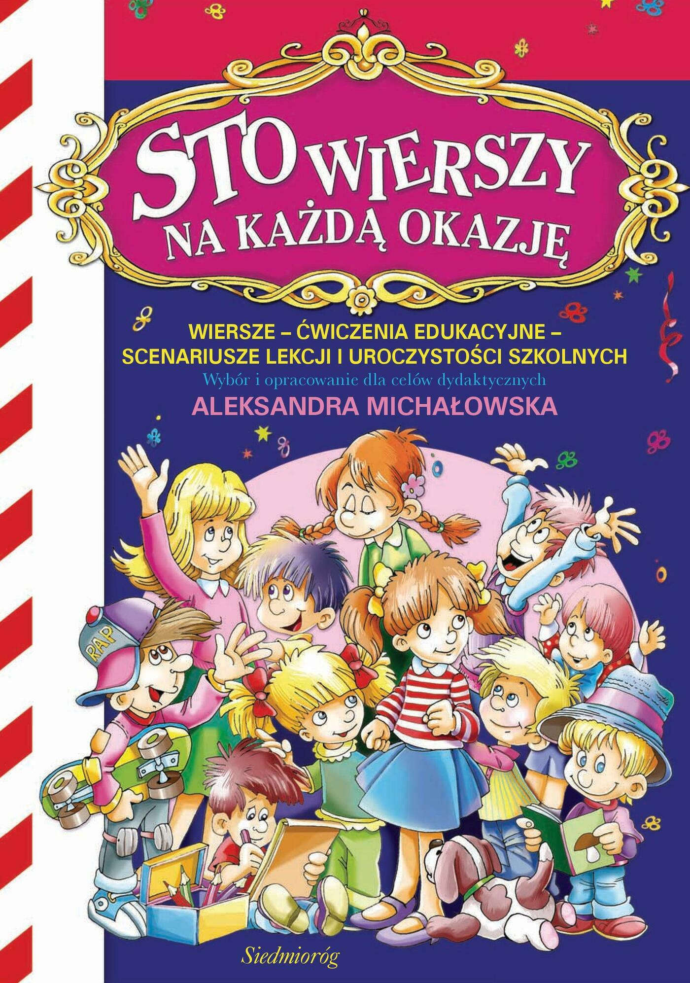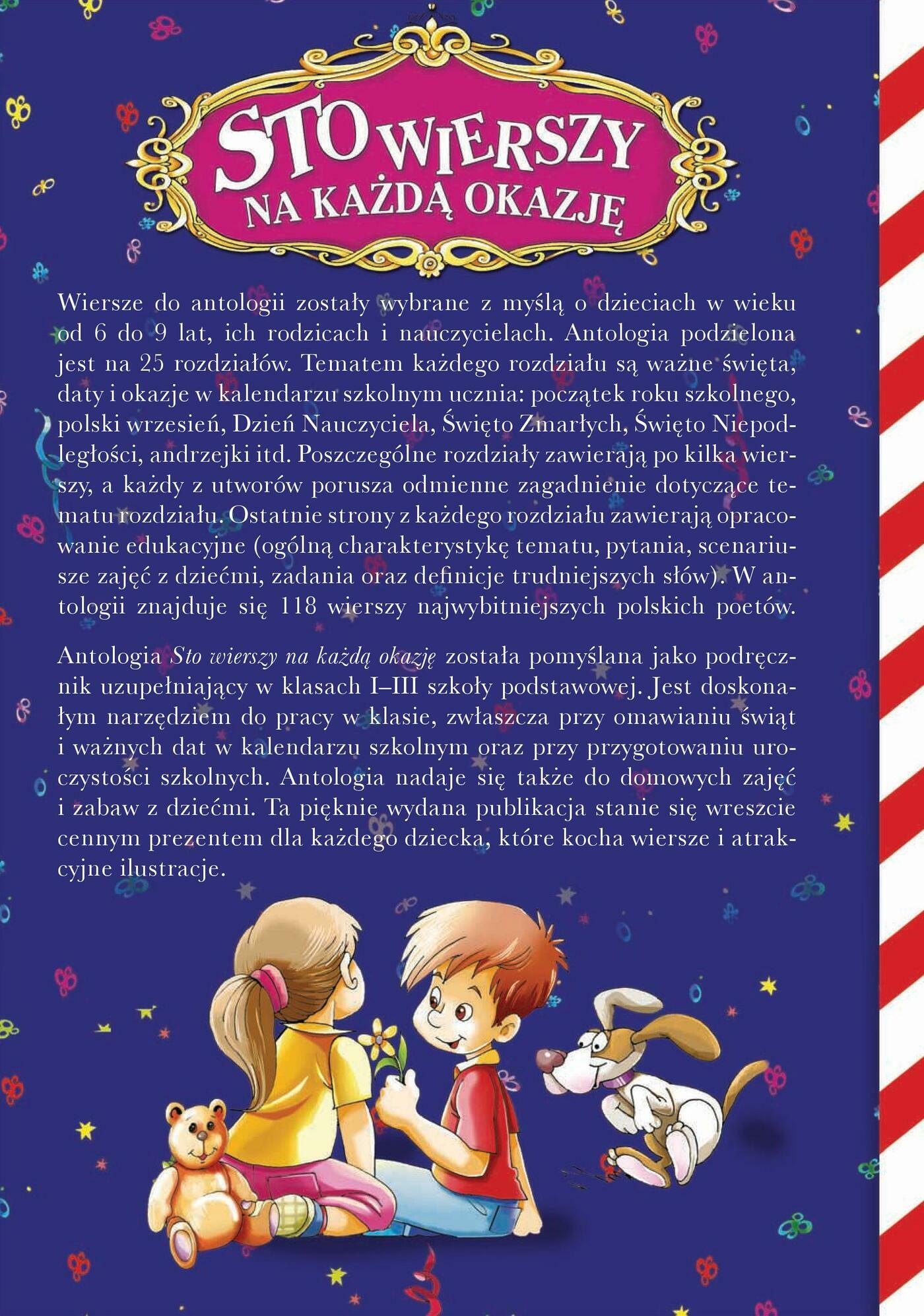 Sto wierszy na każdą okazję został stworzony z myślą o uczniach klas młodszych szkół podstawowych. Składa się z dwudziestu pięciu rozdziałów, których tematami są ważne dla nas Polaków daty w kalendarzu. Poszczególne daty-rozdziały zawierają z jednej strony po kilka wierszy okolicznościowych najwybitniejszych polskich poetów, z drugiej zaś omówienie danej daty, na które składają się: ogólna charakterystyka tematu, pytania, scenariusz zajęć z dziećmi, zadania oraz definicje trudniejszych pojęć i terminów historycznych. Prezentacja każdej daty wzbogacona jest wartościowym i atrakcyjnym dla dziecka materiałem graficznym, który ma za zadanie równocześnie bawić i uczyć. Sto wierszy na każdą okazję jest publikacją edukacyjną nadającą się zarówno do użytku szkolnego, jak i do lektury w domu. Sprawdzi się jako podręcznik uzupełniający w szkołach podstawowych, gdzie spełni rolę narzędzia przy omawianiu rocznic, świąt i tradycji oraz przy przygotowaniu uroczystości szkolnych. Z kolei w szkołach polonijnych przyczyni się do przybliżenia dzieciom polskich tradycji, obyczajów i historii, uczyni namacalną wyjątkową atmosferę najważniejszych dni polskiego kalendarza. Publikacja nadaje się także do zajęć i zabaw z dziećmi w domu, a także na cenny prezent dla każdego małego Polaka.