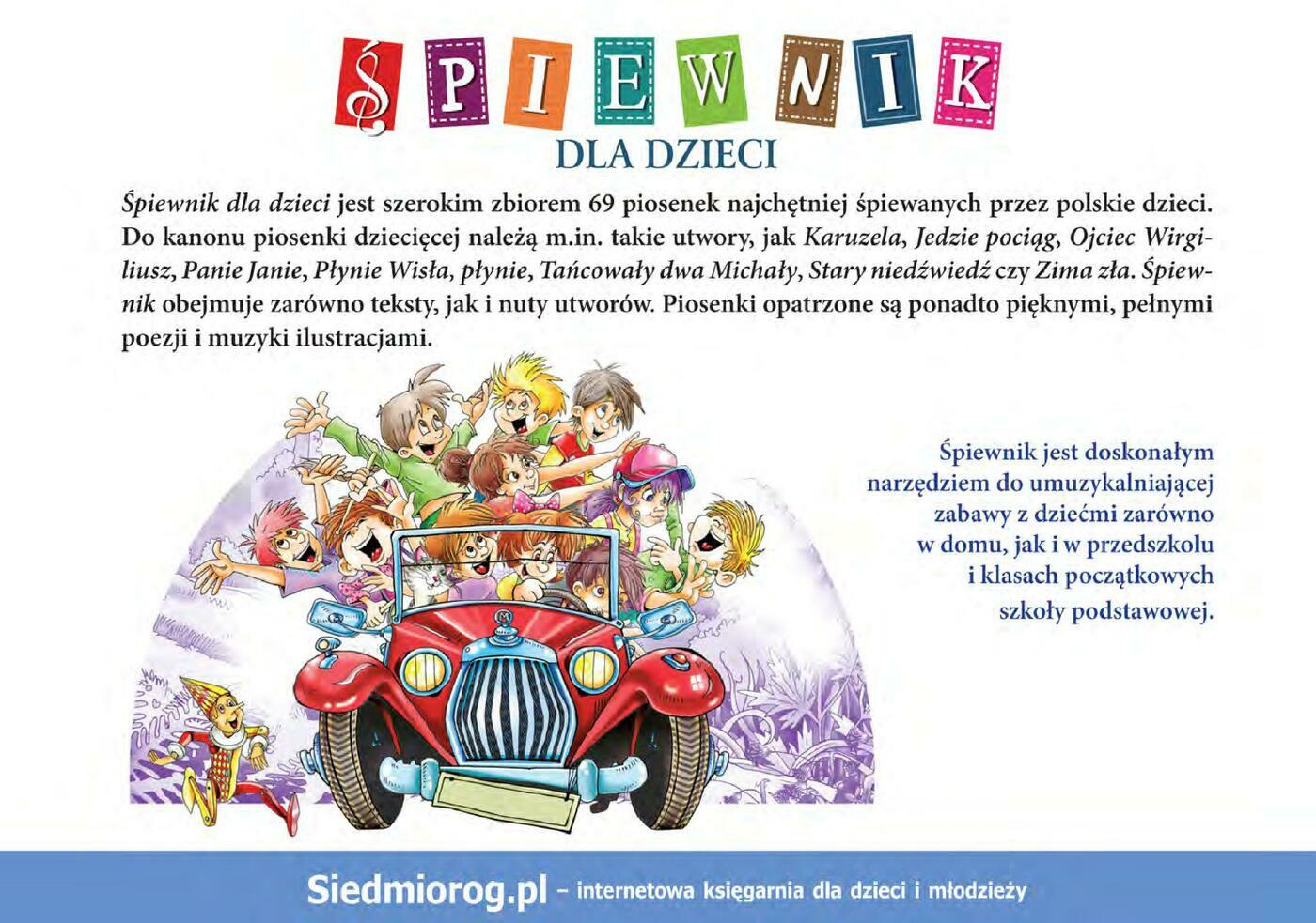 Śpiewnik dla dzieci jest szerokim zbiorem 69 piosenek najchętniej śpiewanych przez polskie dzieci. Do kanonu piosenki dziecięcej należą m.in. takie utwory jak Karuzela, Jedzie pociąg, Ojciec Wirgiliusz, Panie Janie, Płynie Wisła, płynie, Tańcowały dwa Michały, Stary niedźwiedź czy Zima zła. Śpiewnik obejmuje zarówno teksty, jak i nuty utworów. Piosenki opatrzone są ponadto pięknymi, pełnymi poezji i muzyki ilustracjami.Śpiewnik jest doskonałym narzędziem do umuzykalniającej zabawy z dziećmi zarówno w domu, jak w przedszkolu i klasach początkowych szkoły podstawowej.