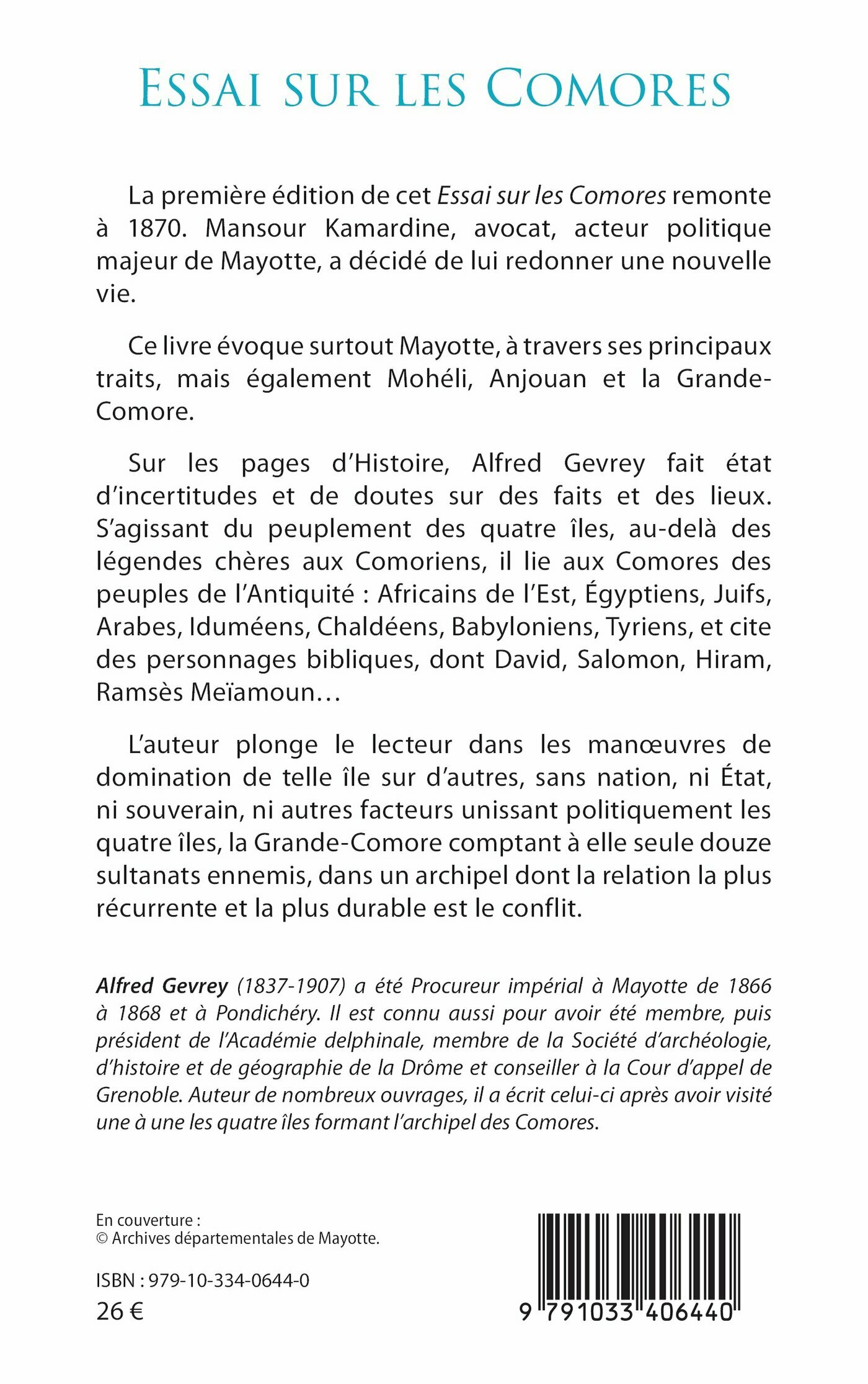 La première édition de cet Essai sur les Comores remonte à 1870. Mansour Kamardine, avocat, acteur politique majeur de Mayotte, a décidé de lui redonner une nouvelle vie.