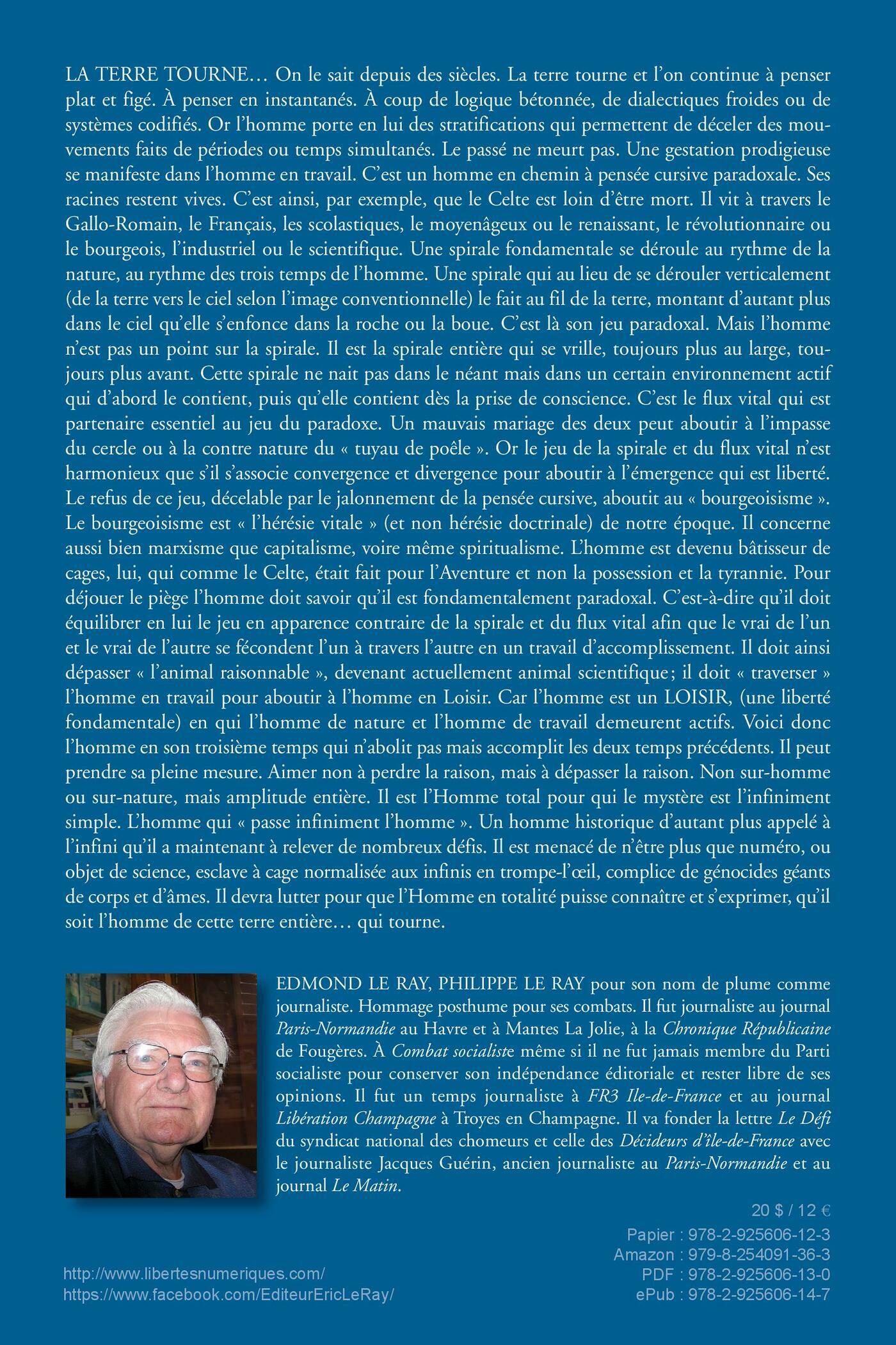 LA TERRE TOURNE… On le sait depuis des siècles. La terre tourne et l’on continue à penser plat et figé. À penser en instantanés. À coup de logique bétonnée, de dialectiques froides ou de systèmes codifiés. Or l’homme porte en lui des stratifications qui permettent de déceler des mouvements faits de périodes ou temps simultanés. Le passé ne meurt pas. Une gestation prodigieuse se manifeste dans l’homme en travail. C’est un homme en chemin à pensée cursive paradoxale. Ses racines restent vives. C’est ainsi, par exemple, que le Celte est loin d’être mort. Il vit à travers le Gallo-Romain, le Français, les scolastiques, le moyen âgeux ou le renaissant, le révolutionnaire ou le bourgeois, l’industriel ou le scientifique. Une spirale fondamentale se déroule au rythme de la nature, au rythme des trois temps de l’homme. Une spirale qui au lieu de se dérouler verticalement (de la terre vers le ciel selon l’image conventionnelle) le fait au fil de la terre, montant d’autant plus dans le ciel qu’elle s’enfonce dans la roche ou la boue. C’est là son jeu paradoxal. Mais l’homme n’est pas un point sur la spirale. Il est la spirale entière qui se vrille, toujours plus au large, toujours plus avant. Cette spirale ne nait pas dans le néant mais dans un certain environnement actif qui d’abord le contient, puis qu’elle contient dès la prise de conscience. C’est le flux vital qui est partenaire essentiel au jeu du paradoxe. Un mauvais mariage des deux peut aboutir à l’impasse du cercle ou à la contre nature du « tuyau de poêle ». Or le jeu de la spirale et du flux vital n’est harmonieux que s’il s’associe convergence et divergence pour aboutir à l’émergence qui est liberté. Le refus de ce jeu, décelable par le jalonnement de la pensée cursive, aboutit au « bourgeoisisme ». Le bourgeoisisme est « l’hérésie vitale » (et non hérésie doctrinale) de notre époque. Il concerne aussi bien marxisme que capitalisme, voire même spiritualisme. L’homme est devenu bâtisseur de cages, lui, qui comme le Celte, était fait pour l’Aventure et non la possession et la tyrannie. Pour déjouer le piège l’homme doit savoir qu’il est fondamentalement paradoxal. C’est-à-dire qu’il doit équilibrer en lui le jeu en apparence contraire de la spirale et du flux vital afin que le vrai de l’un et le vrai de l’autre se fécondent l’un à travers l’autre en un travail d’accomplissement. Il doit ainsi dépasser « l’animal raisonnable », devenant actuellement animal scientifique ; il doit « traverser » l’homme en travail pour aboutir à l’homme en Loisir. Car l’homme est un LOISIR, (une liberté fondamentale) en qui l’homme de nature et l’homme de travail demeurent actifs. Voici donc l’homme en son troisième temps qui n’abolit pas mais accomplit les deux temps précédents. Il peut prendre sa pleine mesure. Aimer non à perdre la raison, mais à dépasser la raison. Non sur-homme ou sur-nature, mais amplitude entière. Il est l’Homme total pour qui le mystère est l’infiniment simple. L’homme qui « passe infiniment l’homme ». Un homme historique d’autant plus appelé àl’infini qu’il a maintenant à relever de nombreux défis. Il est menacé de n’être plus que numéro, ou objet de science, esclave à cage normalisée aux infinis trompe-l’oeil, complice de génocides géants de corps et d’âmes. Il devra lutter pour que l’Homme en totalité puisse connaître et s’exprimer, qu’il soit l’homme de cette terre entière… qui tourne.