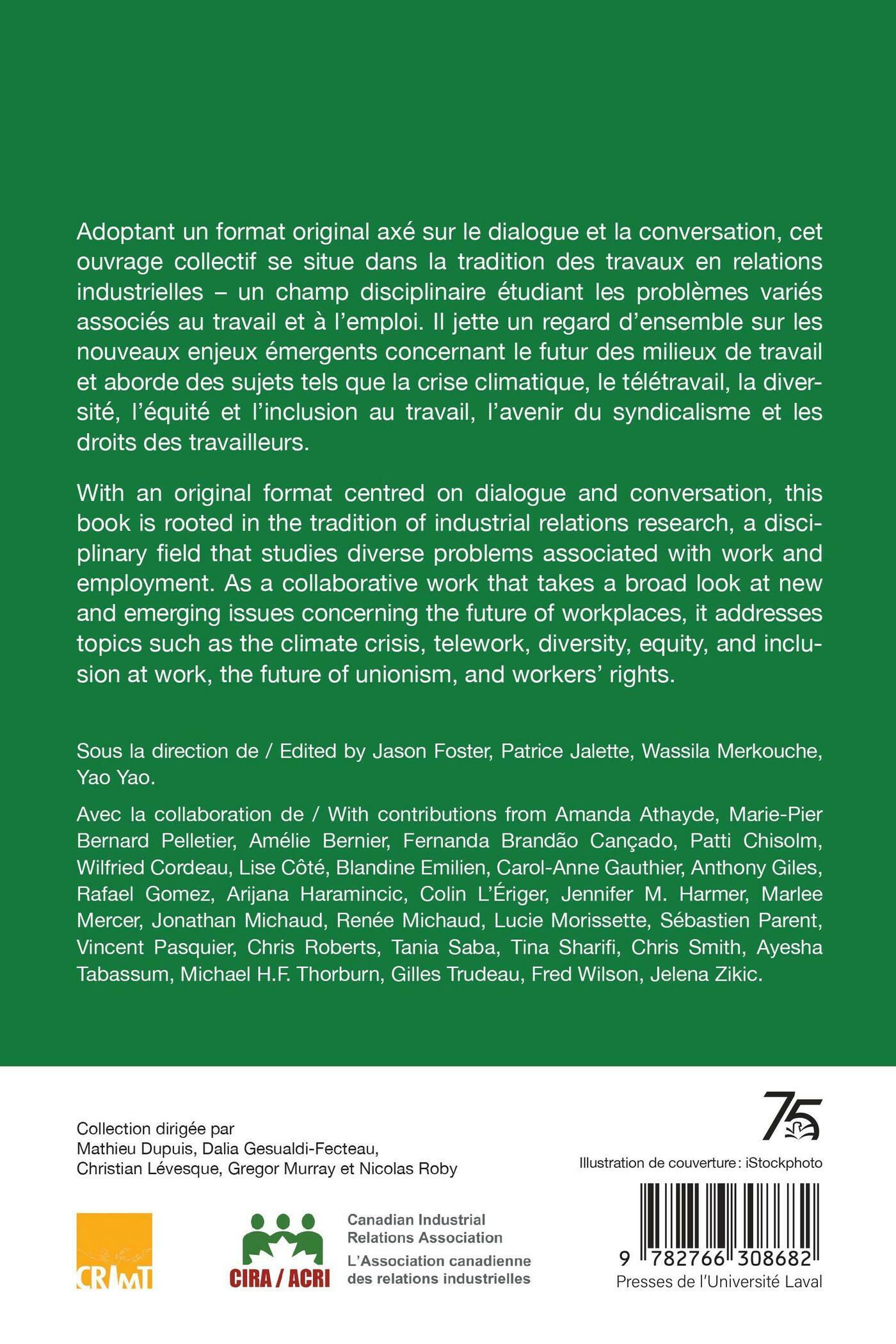 Adoptant un format original axé sur le dialogue et la conversation, cet ouvrage collectif se situe dans la tradition des travaux en relations industrielles – un champ disciplinaire étudiant les problèmes variés associés au travail et à l’emploi. Il jette un regard d’ensemble sur les nouveaux enjeux émergents concernant le futur des milieux de travail et aborde des sujets tels que la crise climatique, le télétravail, la diversité, l’équité et l’inclusion au travail, l’avenir du syndicalisme et les droits des travailleurs.