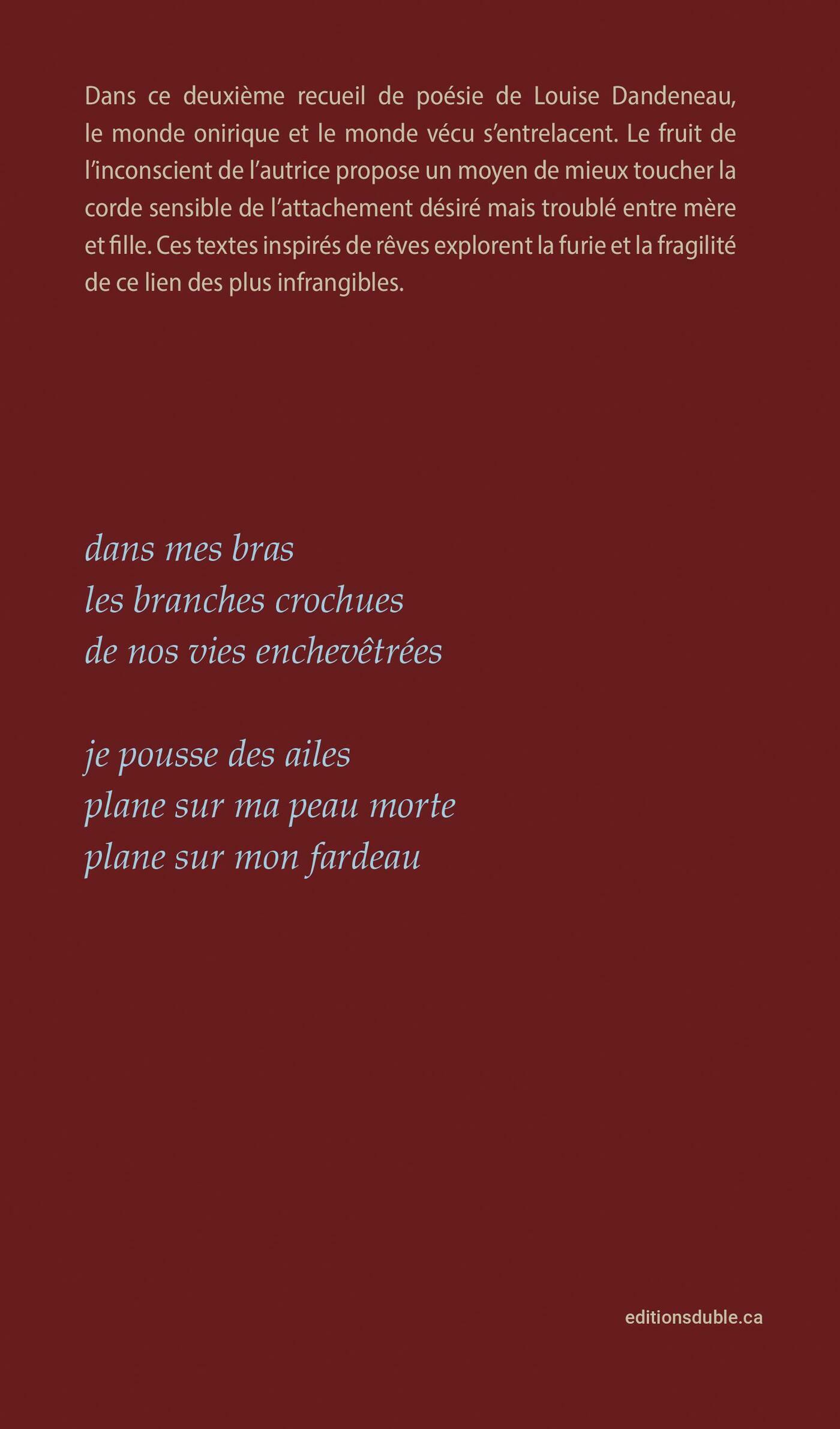 Dans ce deuxième recueil de poésie de Louise Dandeneau, le monde onirique et le monde vécu s’entrelacent. Le fruit de l’inconscient de l’autrice propose un moyen de mieux toucher la corde sensible de l’attachement désiré mais troublé entre mère et fille. Ces textes inspirés de rêves explorent la furie et la fragilité de ce lien des plus infrangibles.