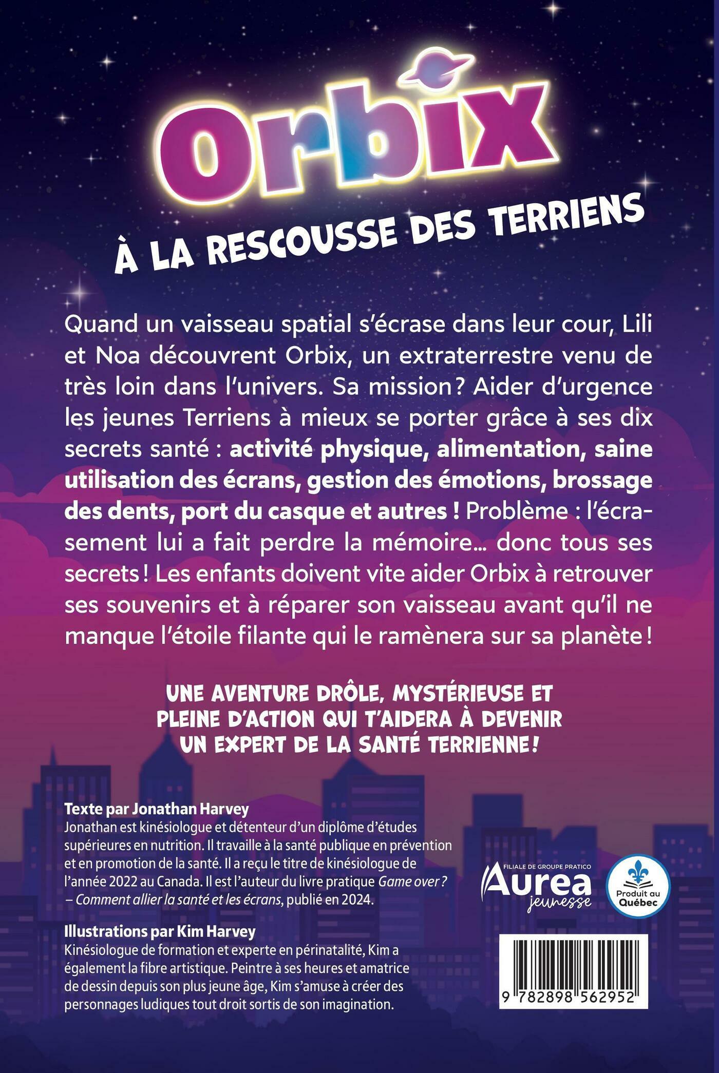 Quand un vaisseau spatial s’écrase dans leur cour, Lili et Noa découvrent Orbix, un extraterrestre venu de très loin dans l’univers. Sa mission ? Aider d’urgence les jeunes Terriens à mieux se porter grâce à ses dix secrets santé : activité physique, alimentation, saine utilisation des écrans, gestion des émotions, brossage des dents, port du casque et autres ! Problème : l’écrasement lui a fait perdre la mémoire… donc tous ses secrets ! Les enfants doivent vite aider Orbix à retrouver ses souvenirs et à réparer son vaisseau avant qu’il ne manque l’étoile filante qui le ramènera sur sa planète !Une aventure drôle, mystérieuse et pleine d’action qui t’aidera à devenir un expert de la santé terrienne !