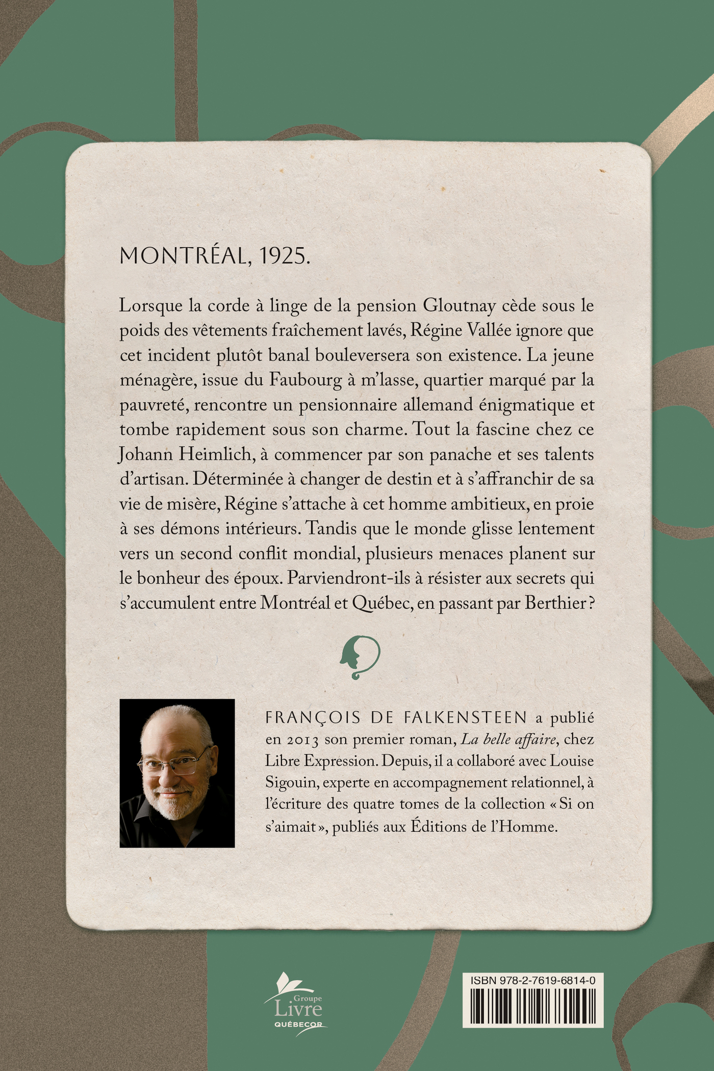 Lorsque la corde à linge de la pension Gloutnay cède sous le poids des vêtements fraîchement lavés, Régine Vallée ignore que cet incident plutôt banal bouleversera son existence. La jeune ménagère, issue du Faubourg à m’lasse, quartier marqué par la pauvreté, rencontre un pensionnaire allemand énigmatique et tombe rapidement sous son charme. Tout la fascine chez ce Johann Heimlich, à commencer par son panache et ses talents d’artisan. Déterminée à changer de destin et à s’affranchir de sa vie de misère, Régine s’attache à cet homme ambitieux, en proie à ses démons intérieurs. Tandis que le monde glisse lentement vers un second conflit mondial, plusieurs menaces planent sur le bonheur des époux. Parviendront-ils à résister aux secrets qui s’accumulent entre Montréal et Québec, en passant par Berthier?