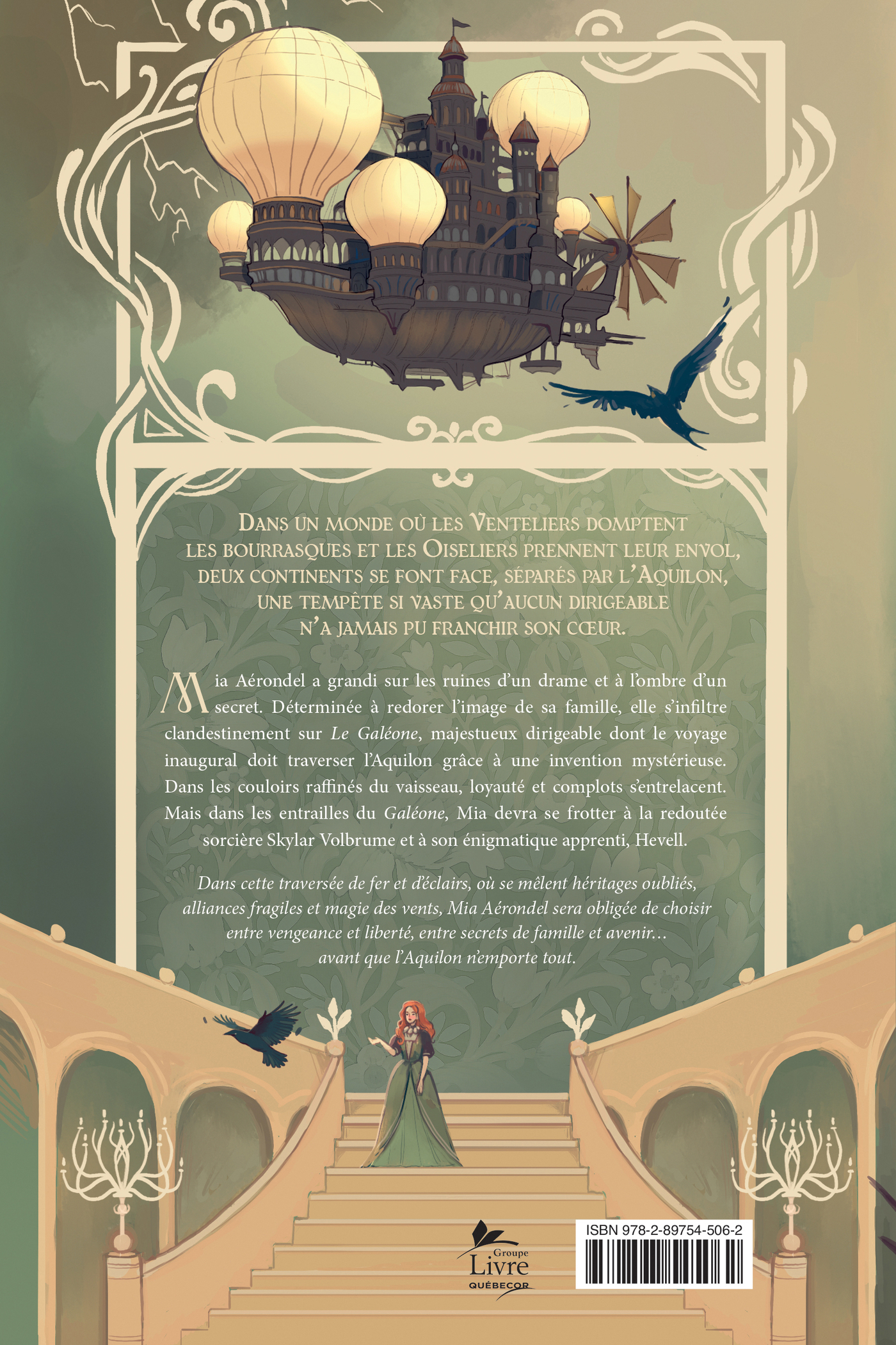 Mia Aérondel a grandi sur les ruines d’un drame et à l’ombre d’un secret. Déterminée à redorer l’image de sa famille, elle s’infiltre clandestinement sur Le Galéone, majestueux dirigeable dont le voyage inaugural doit traverser l’Aquilon grâce à une invention mystérieuse. Dans les couloirs raffinés du vaisseau, loyauté et complots s’entrelacent. Mais dans les entrailles du Galéone, Mia devra se frotter à la redoutée sorcière Skylar Volbrume et à son énigmatique apprenti, Hevell.