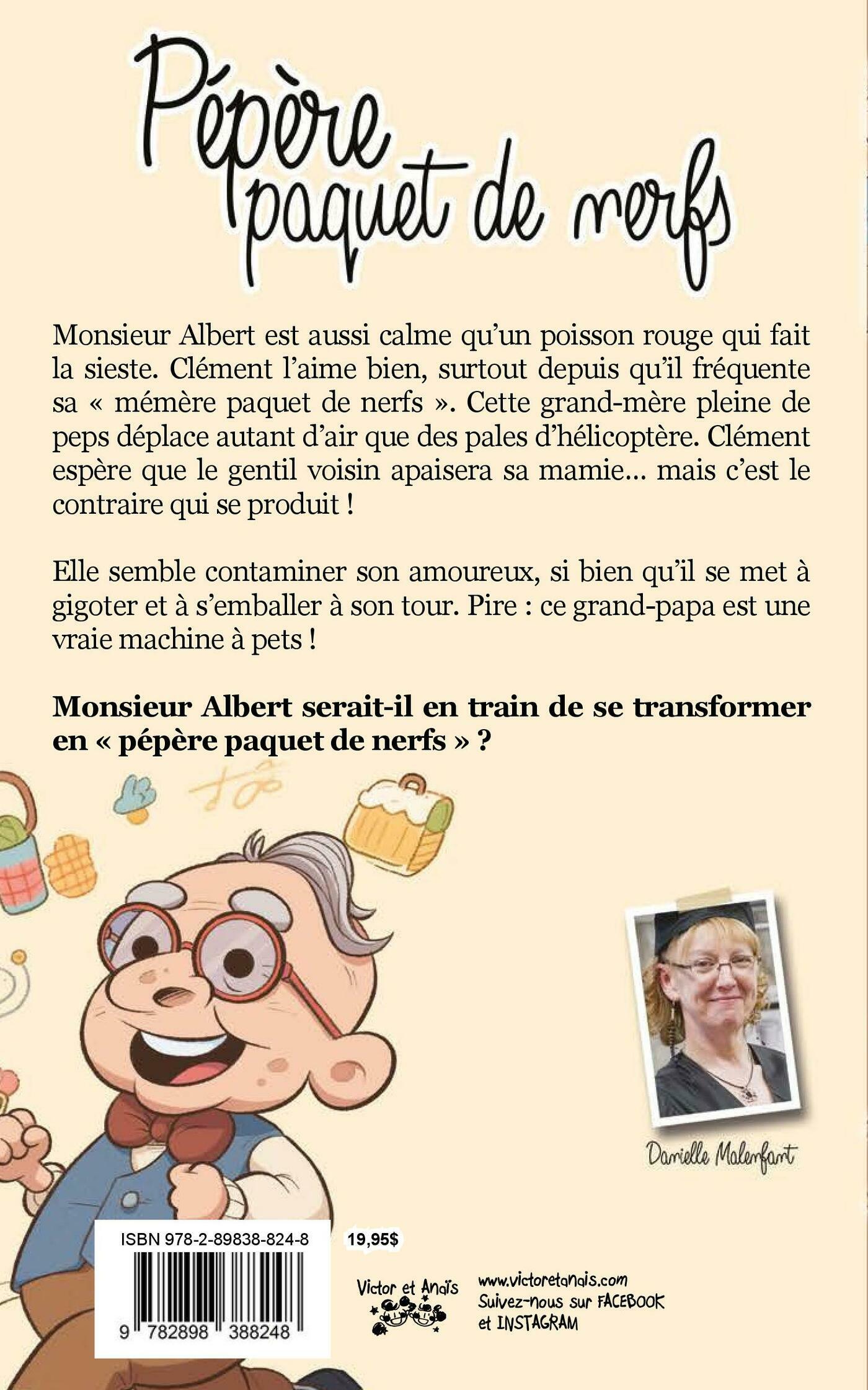 Monsieur Albert est aussi calme qu’un poisson rouge qui fait la sieste. Clément l’aime bien, surtout depuis qu’il fréquente sa « mémère paquet de nerfs ». Cette grand-mère pleine de peps déplace autant d’air que des pales d’hélicoptère. Clément espère que le gentil voisin apaisera sa mamie… mais c’est le contraire qui se produit ! Elle semble contaminer son amoureux, si bien qu’il se met à gigoter et à s’emballer à son tour. Pire : ce grand-papa est une vraie machine à pets ! Monsieur Albert serait-il en train de se transformer en « pépère paquet de nerfs »?