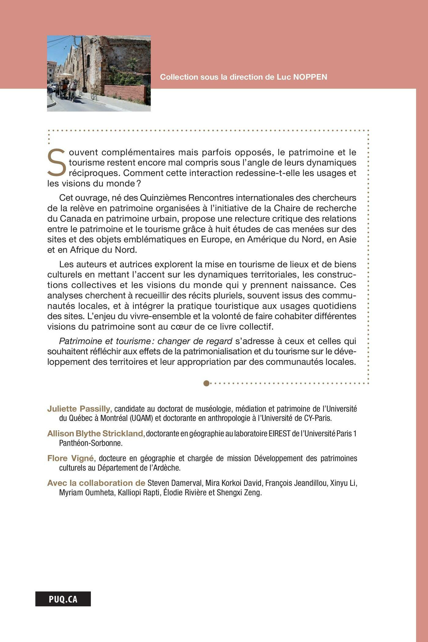 Cet ouvrage, né des Quinzièmes Rencontres internationales des chercheurs de la relève en patrimoine organisées à l’initiative de la Chaire de recherche du Canada en patrimoine urbain, propose une relecture critique des relations entre le patrimoine et le tourisme grâce à huit études de cas menées sur des sites et des objets emblématiques en Europe, en Amérique du Nord, en Asie et en Afrique du Nord.